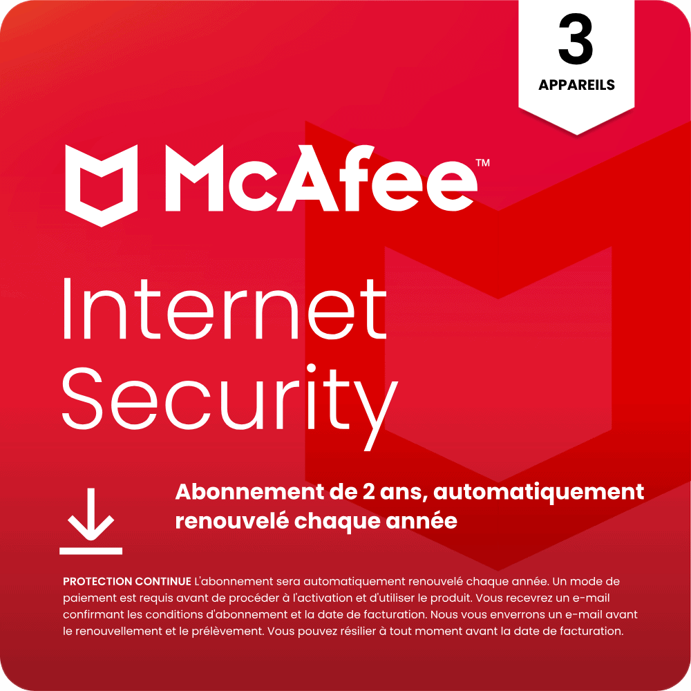 L'abonnement est automatiquement renouvelé chaque année, à moins que vous ne le résiliiez avant la date de facturation prévue sur la page Mon compte. Un mode de paiement est requis avant de procéder à l'activation et d'utiliser le produit. Vous serez débité 30 jours avant la fin de l'abonnement et chaque année par la suite, au prix de renouvellement indiqué sur mcafee.com/fr-fr. Le prix de renouvellement sera le prix en vigueur à ce moment-là et peut différer du prix d'achat initial. Nous vous enverrons un rappel au moins 30 jours avant la date de facturation en vous indiquant le prix de renouvellement applicable. Dans le cadre de notre politique de résiliation et de remboursement (mcafee.com/legal), si vous résiliez votre abonnement, vous pouvez demander un remboursement intégral dans les 30 jours suivant l'achat initial ou chaque renouvellement annuel.