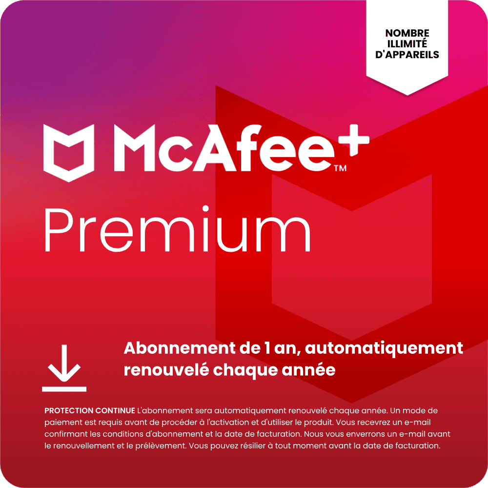 L'abonnement est automatiquement renouvelé chaque année, à moins que vous ne le résiliiez avant la date de facturation prévue sur la page Mon compte. Un mode de paiement est requis avant de procéder à l'activation et d'utiliser le produit. Vous serez débité 30 jours avant la fin de l'abonnement et chaque année par la suite, au prix de renouvellement indiqué sur mcafee.com/fr-fr. Le prix de renouvellement sera le prix en vigueur à ce moment-là et peut différer du prix d'achat initial. Nous vous enverrons un rappel au moins 30 jours avant la date de facturation en vous indiquant le prix de renouvellement applicable. Dans le cadre de notre politique de résiliation et de remboursement (mcafee.com/legal), si vous résiliez votre abonnement, vous pouvez demander un remboursement intégral dans les 30 jours suivant l'achat initial ou chaque renouvellement annuel.